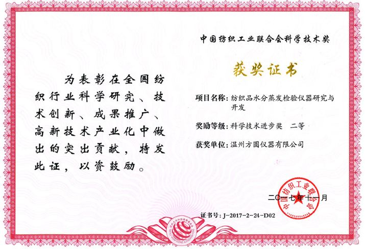 近日,在由中國紡織工業(yè)聯(lián)合會主辦、紡織之光科技教育基金會協(xié)辦的“紡織之光”2017年度中國紡織工業(yè)聯(lián)合會科技教育獎勵大會上,溫州方圓儀器有限公司參評的“紡織品水分蒸發(fā)檢驗儀器研究與開發(fā)”、“高導熱化纖長絲及其新型涼感織物生產(chǎn)關(guān)鍵技術(shù)”雙雙榮獲“科學技術(shù)進步獎二等獎”。